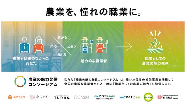これまで農業に縁がなかった方々が、新たに「職業としての農業の魅力」を発見してもらう機会をつくるため、農林水産省の補助事業「農業の魅力発信事業」を活用して、農業と生産者の接点となる企業等、民間企業7社による「農業の魅力発信コンソーシアム」が設立されました。