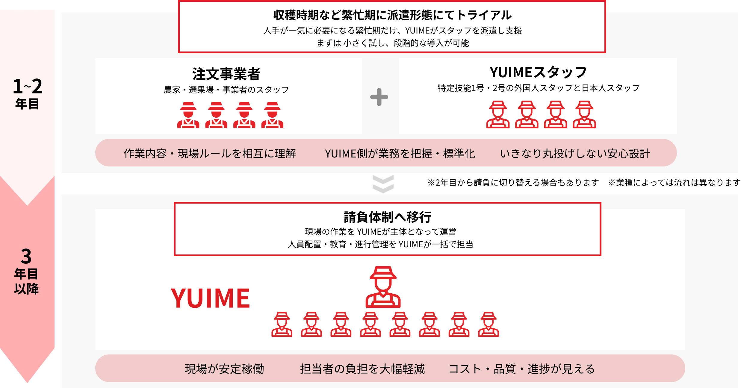YUIMEの農作業請負は、まず繁忙期のトライアル派遣からスタートします。